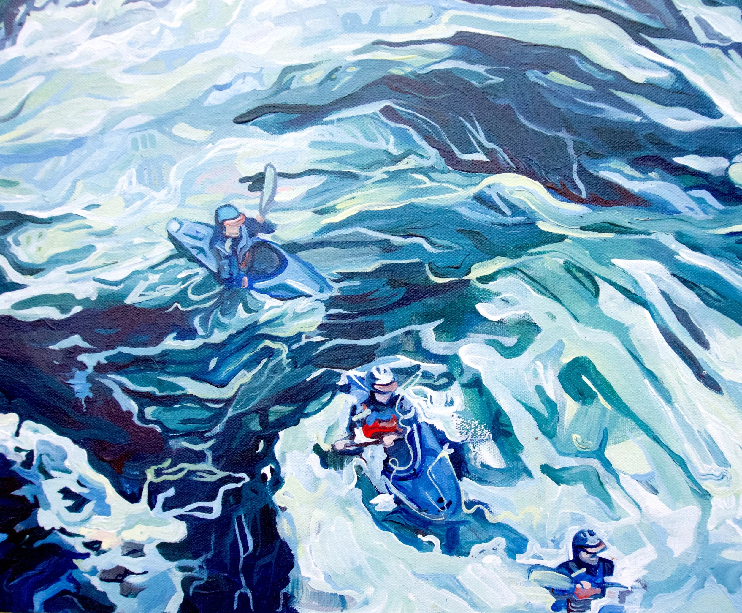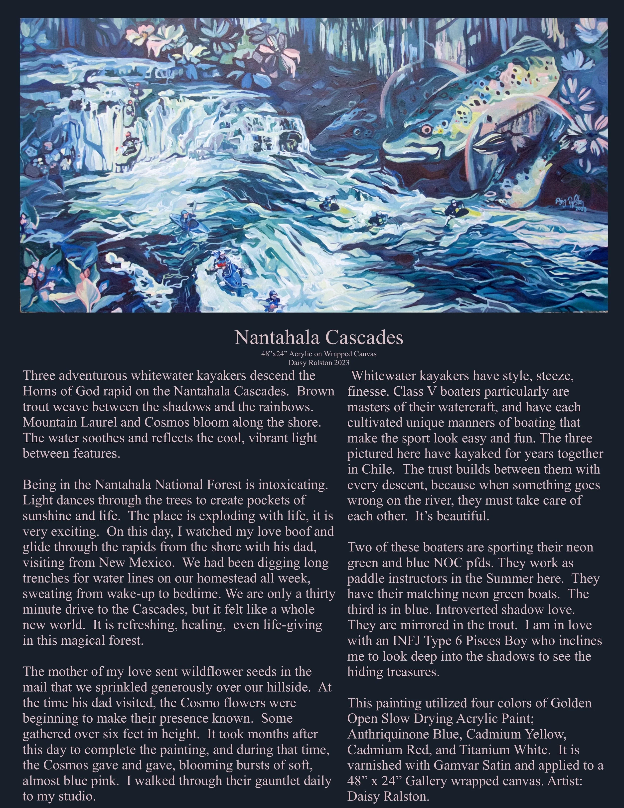 Three adventurous whitewater kayakers descend the Horns of God rapid on the Nantahala Cascades. Brown trout weave between the shadows and the rainbows. Mountain Laurel and Cosmos bloom along the shore. The water soothes and reflects the cool, vibrant light between features.