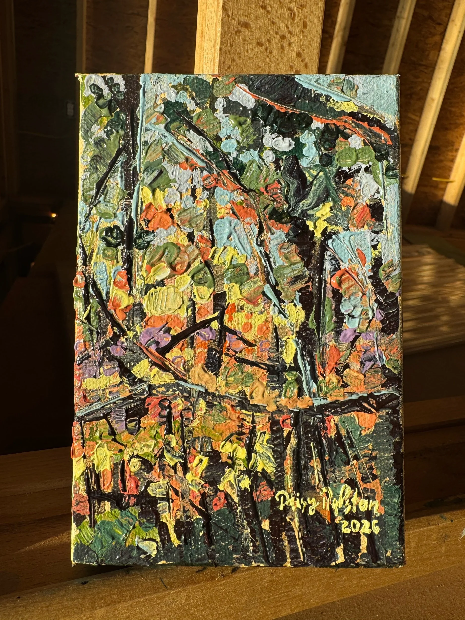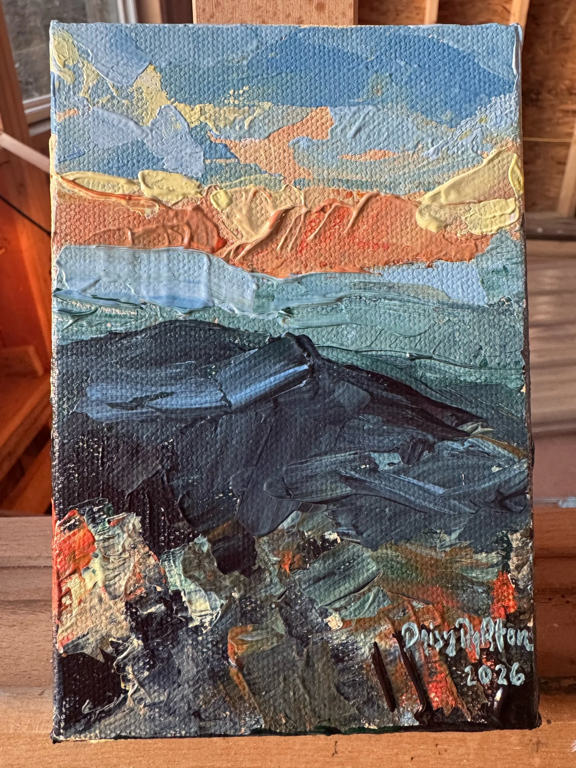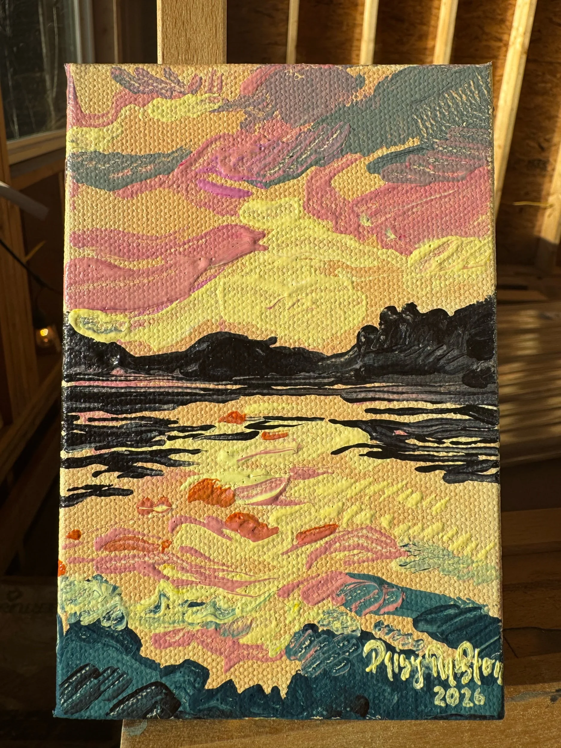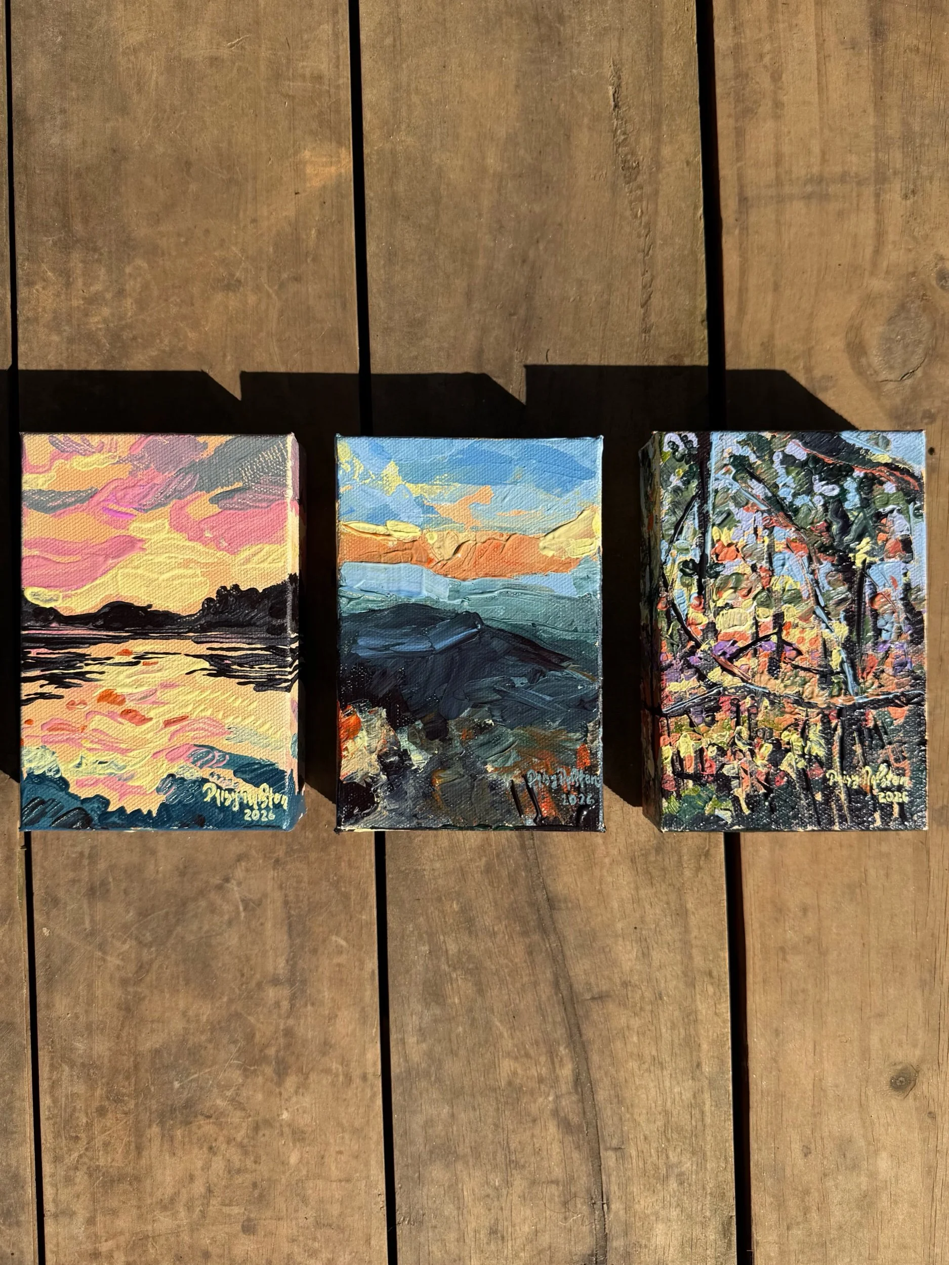 A series of three small original sunset paintings, each 4” x 6” acrylic on gallery wrapped canvas.