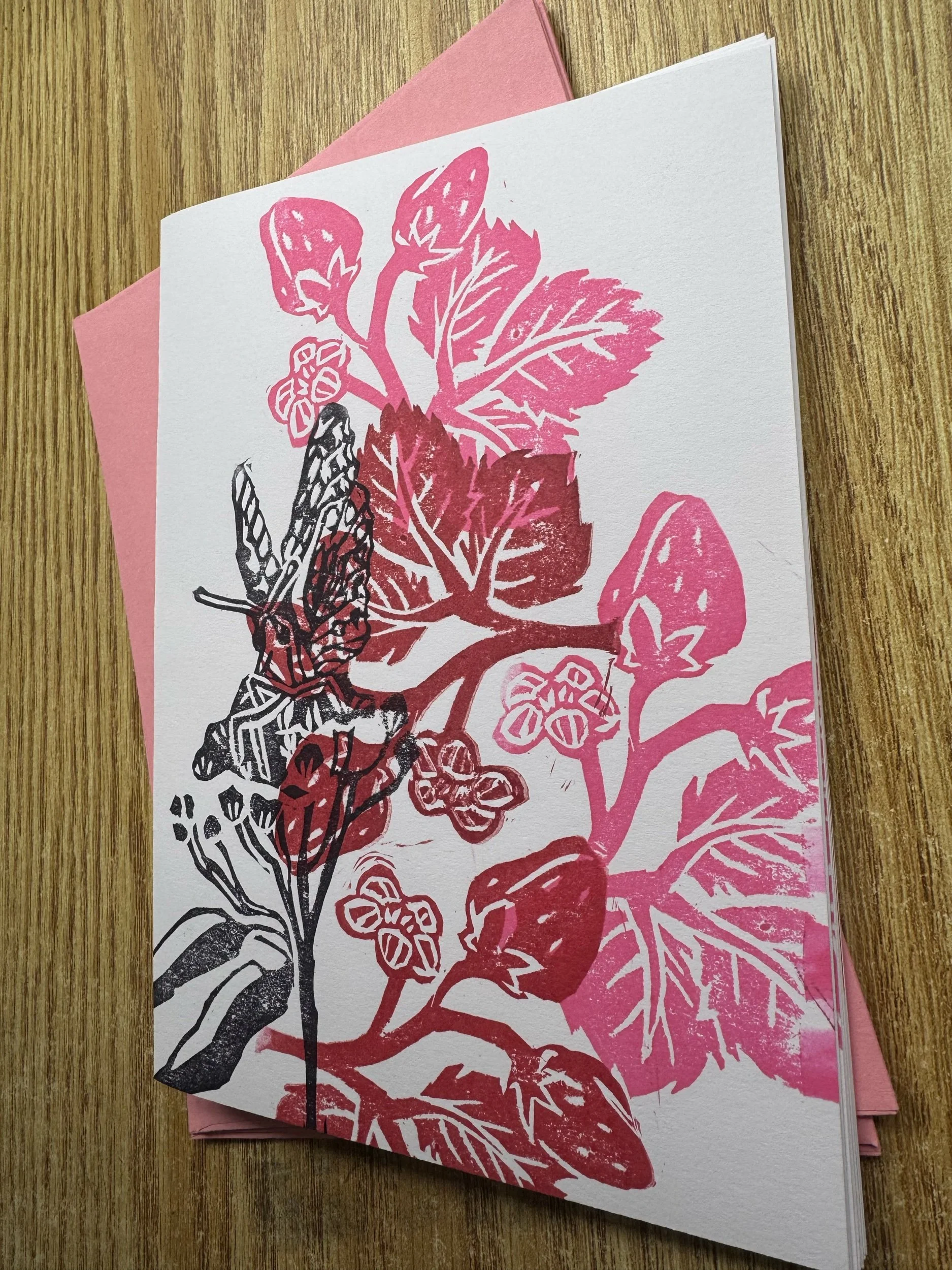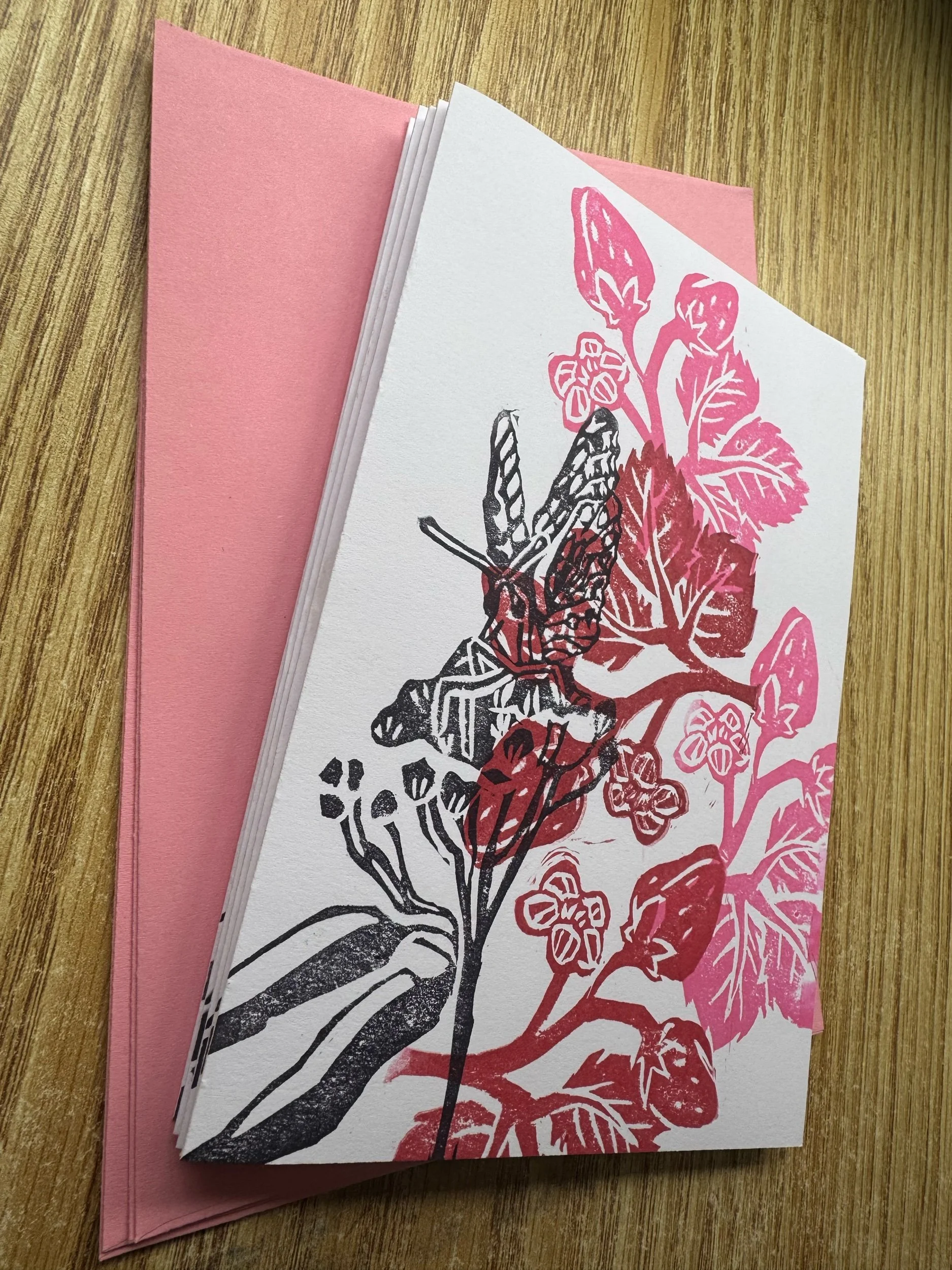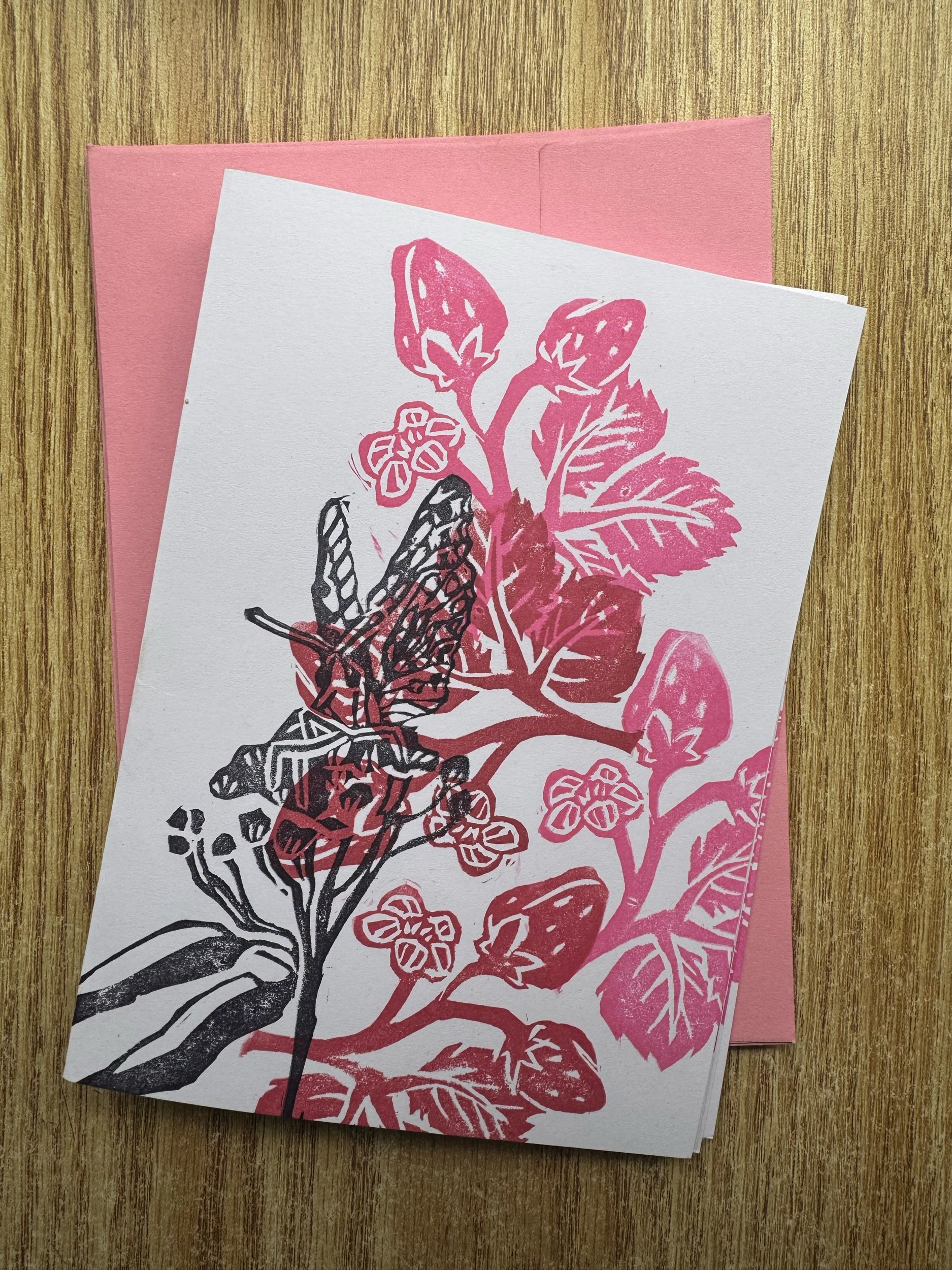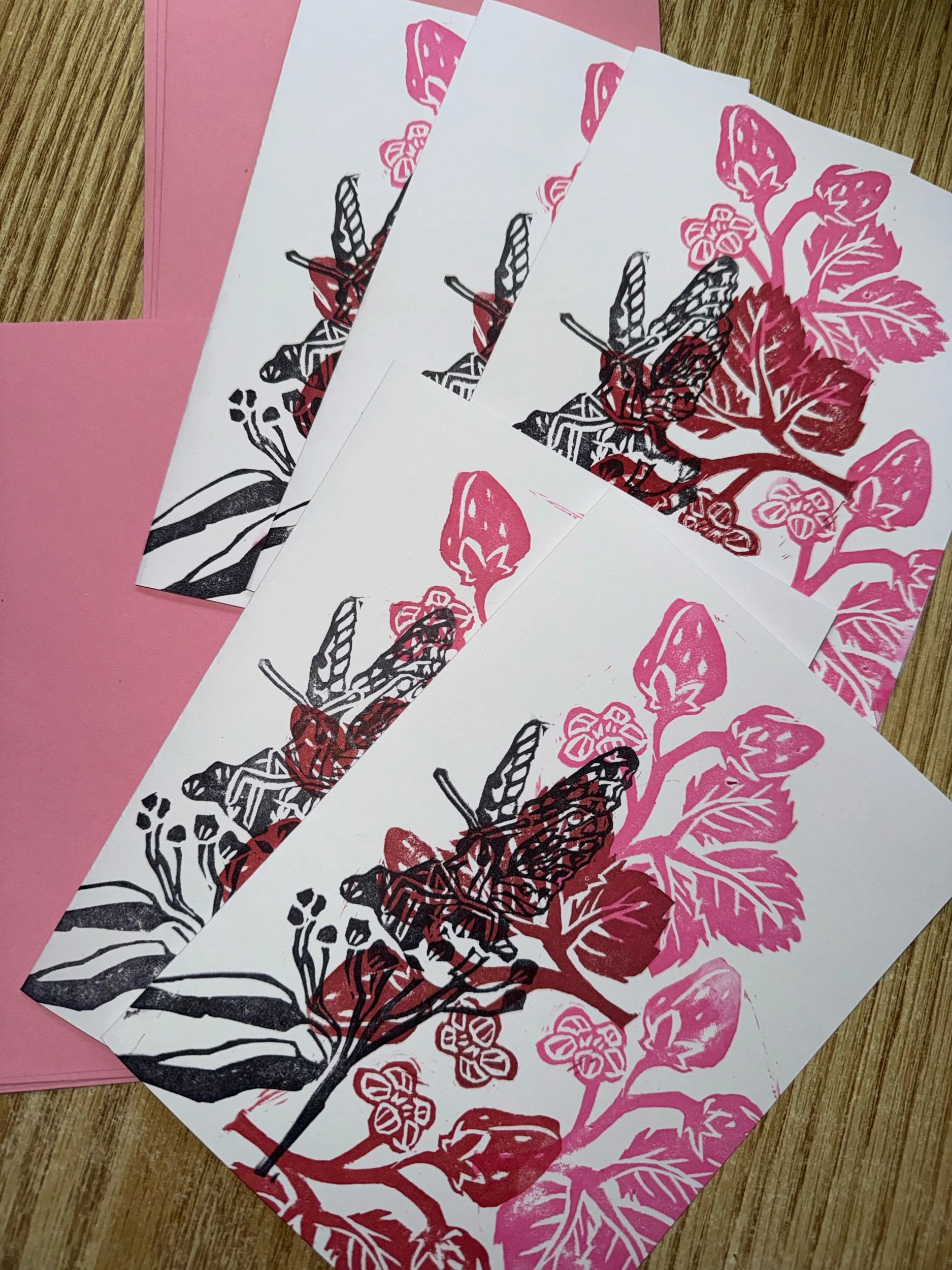Pack of 5 handmade greeting cards. Hand carved lino block prints of strawberries and butterfly in pink, red and black. Printed on 5”x7” folded heavy white cardstock, blank interior, and paired with pink envelopes. Great for any occasion, like thank yous, greetings, celebrations, and sympathies. Art inspired by artist’s garden.